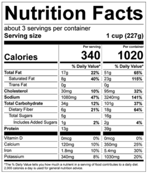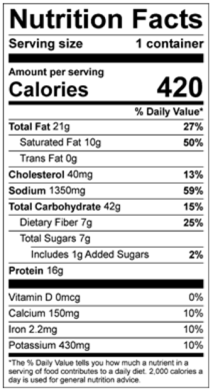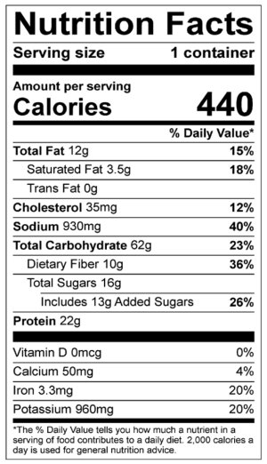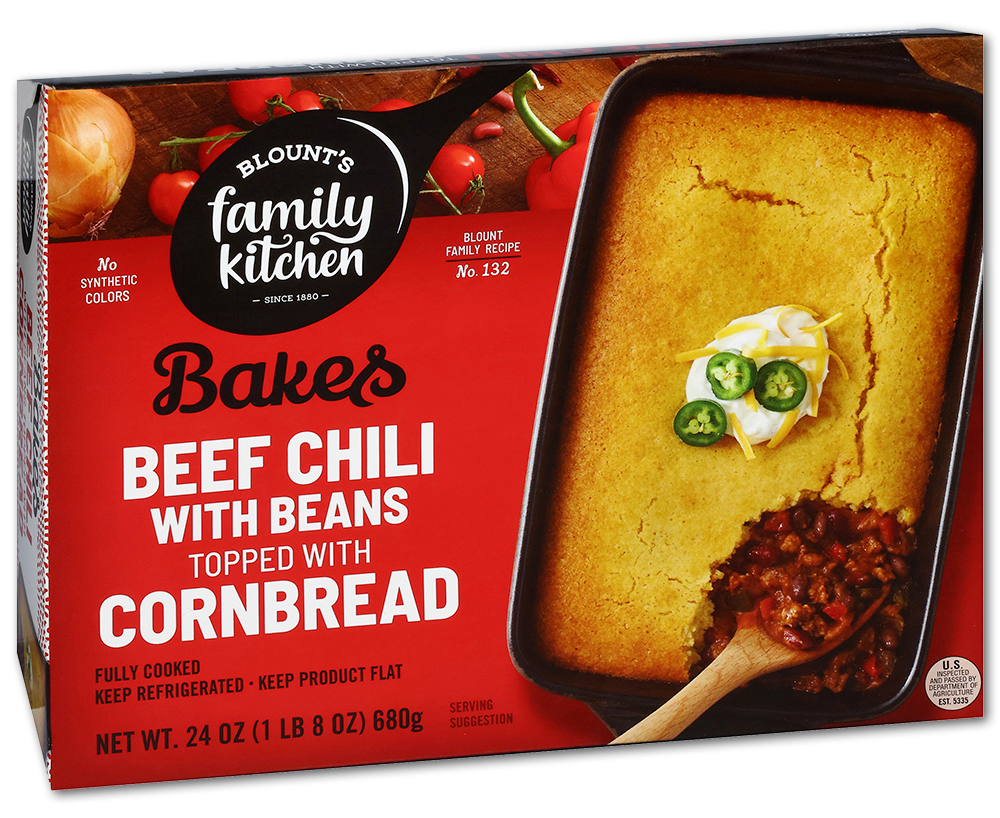 Ground Beef, Tomatoes (Tomatoes, Tomato Puree, Salt), Cornbread Mix (Enriched Bleached Wheat Flour [Wheat Flour, Malted Barley Flour, Niacin, Reduced Iron, Thiamin Mononitrate, Riboflavin, Folic Acid], Sugar, Degermed Yellow Cornmeal, Soybean Oil, Salt, Leavening [Baking Soda, Sodium Acid Pyrophosphate], Dextrose, Egg Whites, Modified Food Starch, Nonfat Milk, Honey Powder, Natural Flavor), Water, Cooked Kidney Beans, Cooked Black Beans, Red Bell Peppers, Green Bell Peppers, Yellow Bell Peppers, Contains 2% Or Less Of: Beef Broth Base (Beef, Beef Stock, Salt, Sugar, Onion Powder, Garlic Powder, Yeast Extract, Spice, Xanthan Gum), Onions, Modified Corn Starch, Canola Oil, Garlic, Chipotle Pepper Concentrate (Red Peppers, Chipotle Chili Pepper Powder, Salt, Natural Smoke Flavor, Natural Flavor), Distilled Vinegar, Water, Salt, Dehydrated Garlic, Apple Cider Vinegar, Cilantro, Lime Juice, Natural Flavor, Concentrated Beef Stock, Salt, Carrot Powder, Celery Seed, Yeast Extract, Spices. Contains: Egg, Milk, And Wheat.