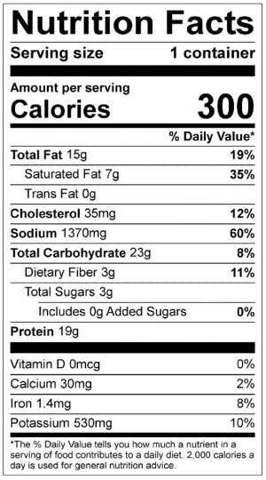 Potatoes (Water, Potatoes, Butter, Sea Salt), Seasoned Cooked Beef (Beef, Salt), Water, Corn, Peas, Carrots, Onions, Beef Broth Base (Beef, Beef Stock, Salt, Sugar, Onion Powder, Garlic Powder, Yeast Extract, Spice, Xanthan Gum), Butter (Cream, Salt), Vegetable Base (Cooked Vegetables [Carrots, Onion, Celery], Salt, Sugar, Corn Oil, Potato Flour, Natural Flavor, Maltodextrin, Carrot Powder), Salt, Corn Starch, Wheat Flour, Parmesan Cheese (Pasteurized Part Skim Milk, Cheese Culture, Salt, Enzymes), Spices.